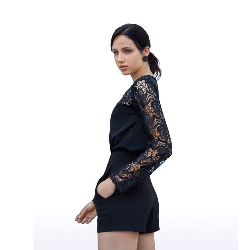 Blusa em Poliéster. Shape acinturado, mangas longas em renda, recorte e decote redondo. Ideal para usar com calças jeans ou shorts de alfaiataria. Look Romantic.