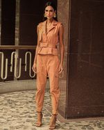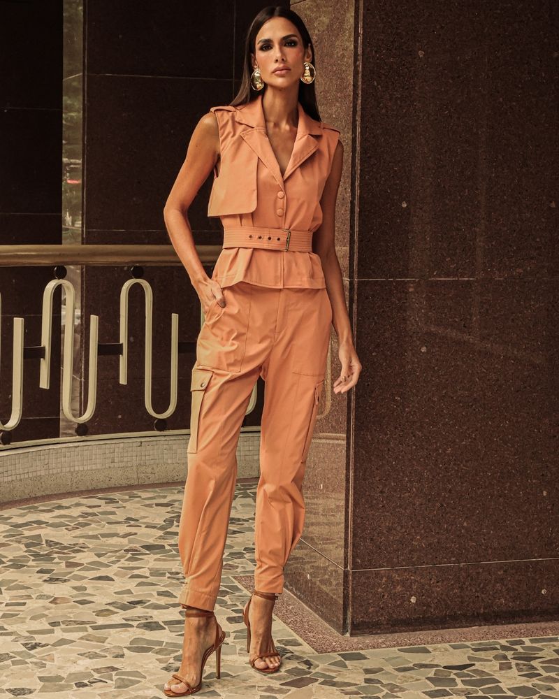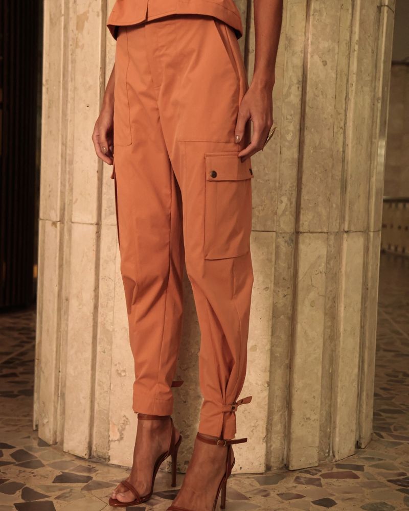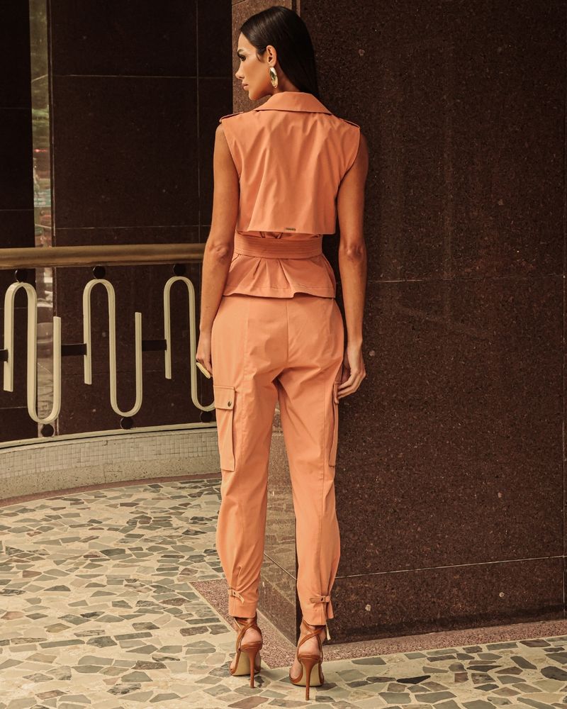 Calça Bege em Poliéster. Modelo em sarja, cós alto, ajustada, com bolsos foli lateral, bolsos sobrepostos, recortes com pespontos frente e costa, martingale na barra com fivela dourada, fechamento em zíper com botão encapado. Ideal para usar com colete ou t-shirt. Look Casual Chic.
