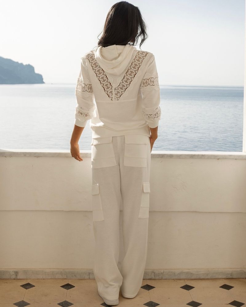 Calça Off White em Algodão com Poliéster. Modelo pantalona, cós alto com cordão para amarração, bolsos arredondados, bolsos sobrepostos laterais, recortes com pespontos rentes e zigzag nas laterais. Ideal para usar moletom ou camisa. Look Confort Chic.