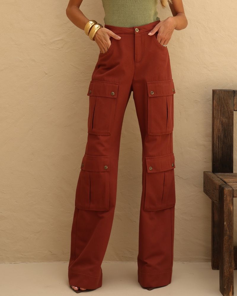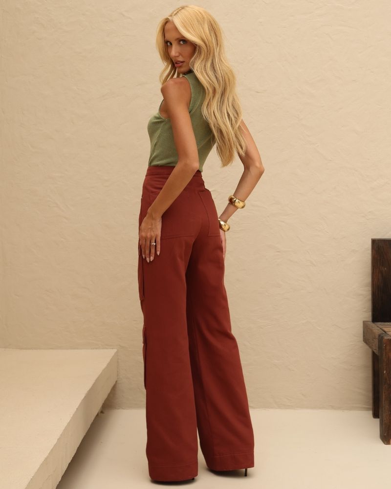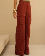 Calça Marrom Avelã em Algodão. Modelo em sarja, cargo, pantalona, passantes, bolsos frontais quadrados com lapelas, pespontos duplos e fechamento em zíper com botão estilo ouro velho. Ideal para usar com regata ou t-shirt. Look Casual Chic.