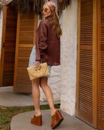 Camisa Marrom Toffe em Linho. Modelo reta, mangas longas com martingale para regulagem, gola, patô e fechamento em botões frontais. Ideal para usar com calça ou short de linho. Look Classic.