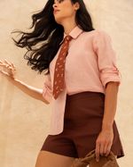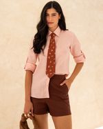 Camisa Rosa em Linho. Modelo reta, mangas longas com martingale para regulagem, gola, patô e fechamento em botões frontais. Ideal para usar com calça de alfaiataria ou short-saia. Look Classic.