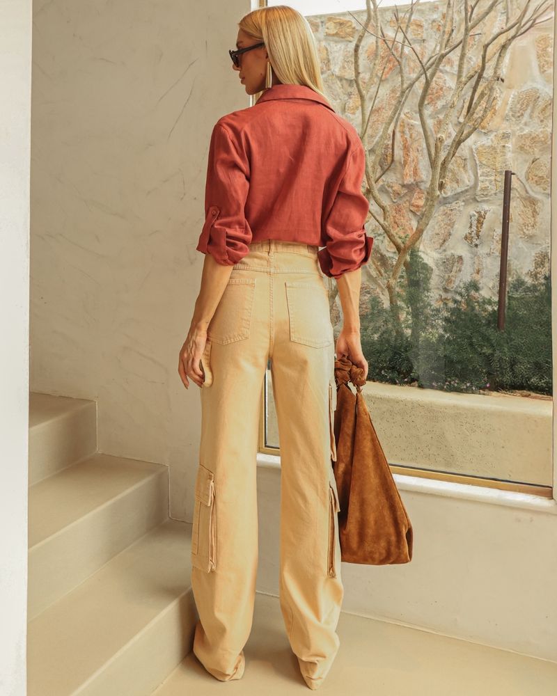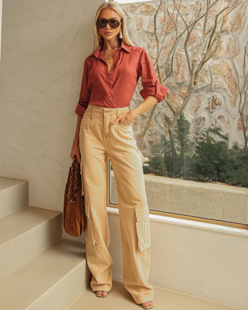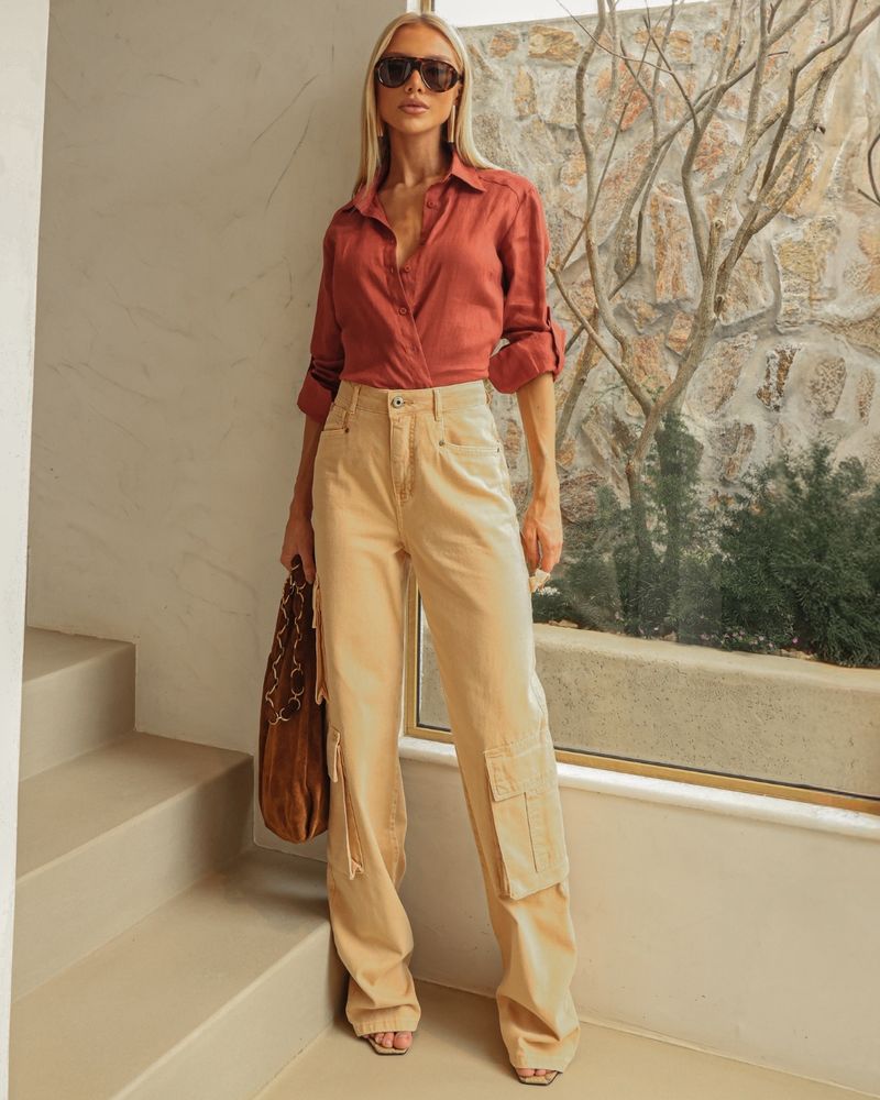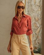 Camisa Terracota em Linho. Modelo reta, mangas longas com martingale para regulagem, gola, patô e fechamento em botões frontais. Ideal para usar com calça cargo ou short alfaiataria. Look Classic.