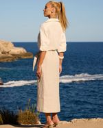 Camisa Natural em Linho. Modelo reta, mangas longas com martingale para regulagem, gola, patô e fechamento em botões frontais. Ideal para usar com calça de alfaiataria ou saia. Look Classic.