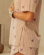 Camisa Stripe Colors Flowers Framboesa Bordada. Modelo em Algodão, mangas curtas, gola, bolso frontal, patô e fechamento em botões frontais. Ideal para usar com calça ou short. Look Romantic Comfy.