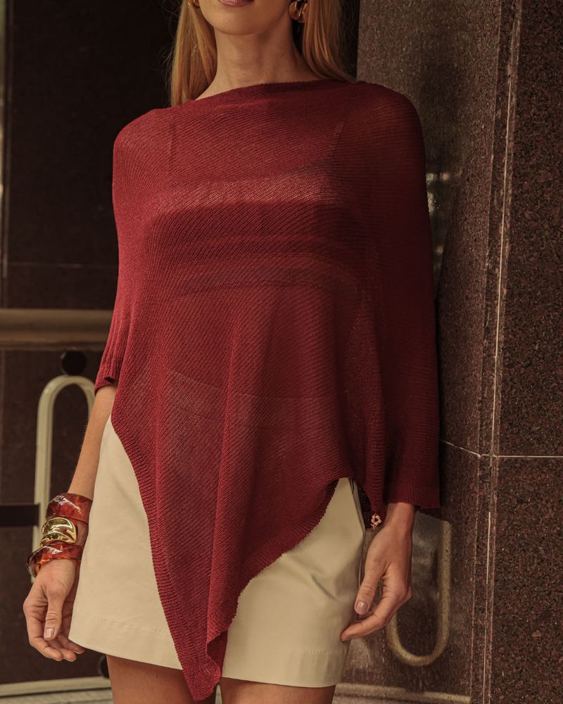 Sobreposição Vinho tipo Capa em Tricot. Modelo solto, assimétrico. Ideal para usar com calça e short. Look Fashion.