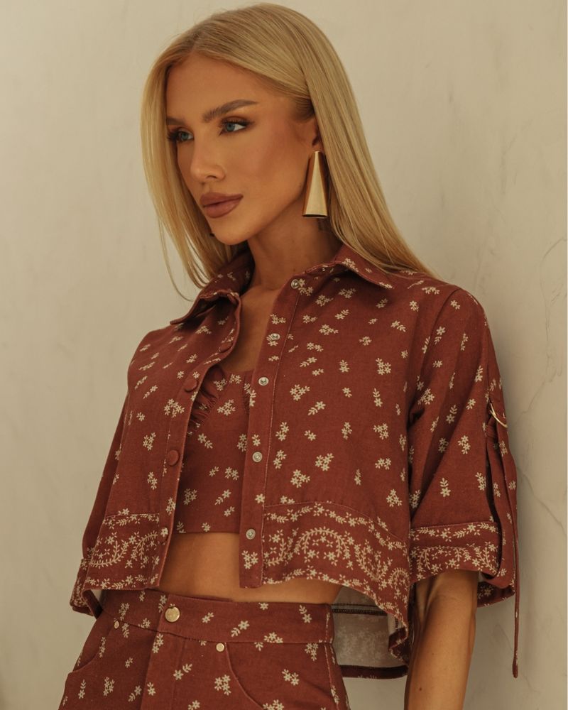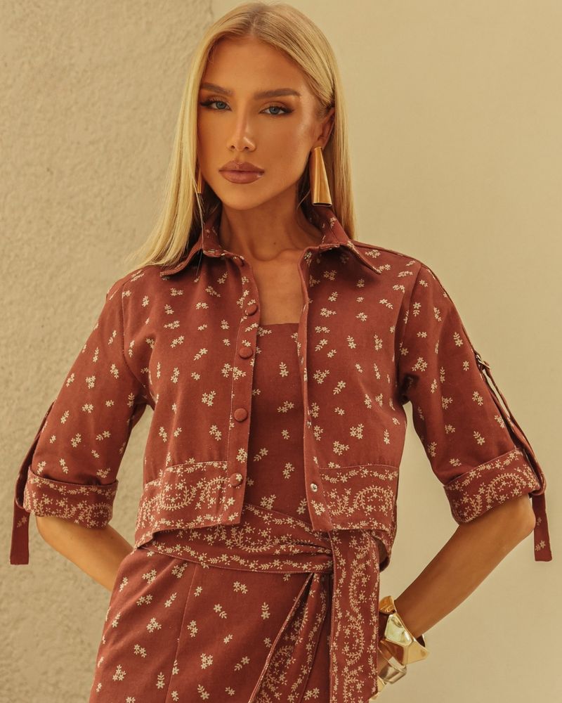 Casaqueto Avelã em Algodão. Modelo em Sarja, reto, estampado, com gola dupla pespontada, mangas curtas com martingale, fechamento frontal com botões de pressão. Ideal para usar com Short-saia ou calça de cós alto. Look Fashion.