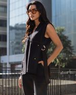Colete Preto em Algodão com Poliéster. Modelo em moletom, capuz, cavado, decote "V", recortes com pespontos duplos em linha ocrê, bolsos e faixa dupla para amarração lateral. Ideal para usa com calça de moletom ou como sobreposição. Look Cool.