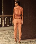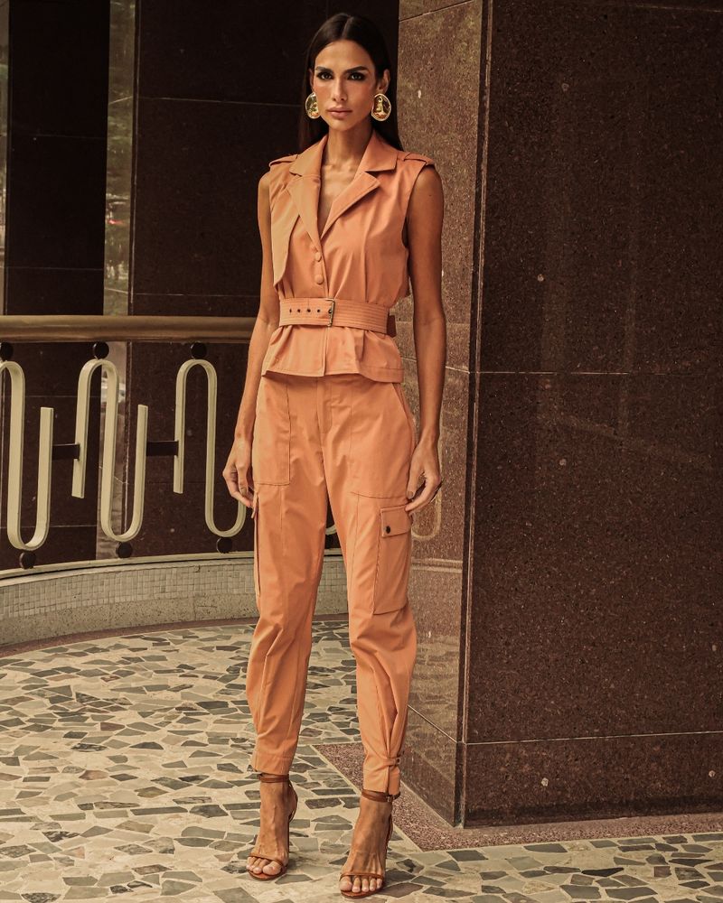 Colete Bege em Poliéster. Modelo em sarja, gola dupla em V com pesponto, cavado com martingale no ombro, recortes frontal com fechamento em botão de pressão. Pala dupla nas costas, (acompanha faixa pespontada com fivela dourada e regulagem). Ideal para usar com short ou calça de cós alto. Look Fashion Cool.