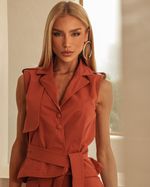 Colete Trench Marrom Ginger em Poliéster. Modelo em sarja, gola dupla em V com pesponto, cavado com martingale no ombro, recortes frontal com fechamento em botão de pressão. Pala dupla nas costas, (acompanha faixa pespontada com fivela dourada e regulagem). Ideal para usar com short ou calça de cós alto. Look Fashion Cool.