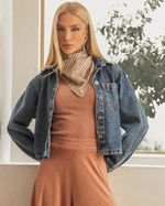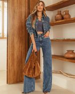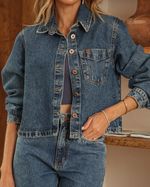 Jaqueta Jeans em Algodão. Modelo cropped, mangas longas, bolsos sobrepostos e fechamento em botões. Ideal para usar como sobreposição no look. Look Fashion Cool.