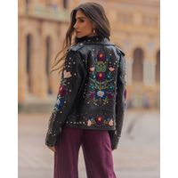 Jaqueta Preta em Couro. Shape acinturado, mangas longas, recortes com pespontos, bordado costas fechamento em zíper. Ideal para usar com calça ou saia midi. Look Chic.