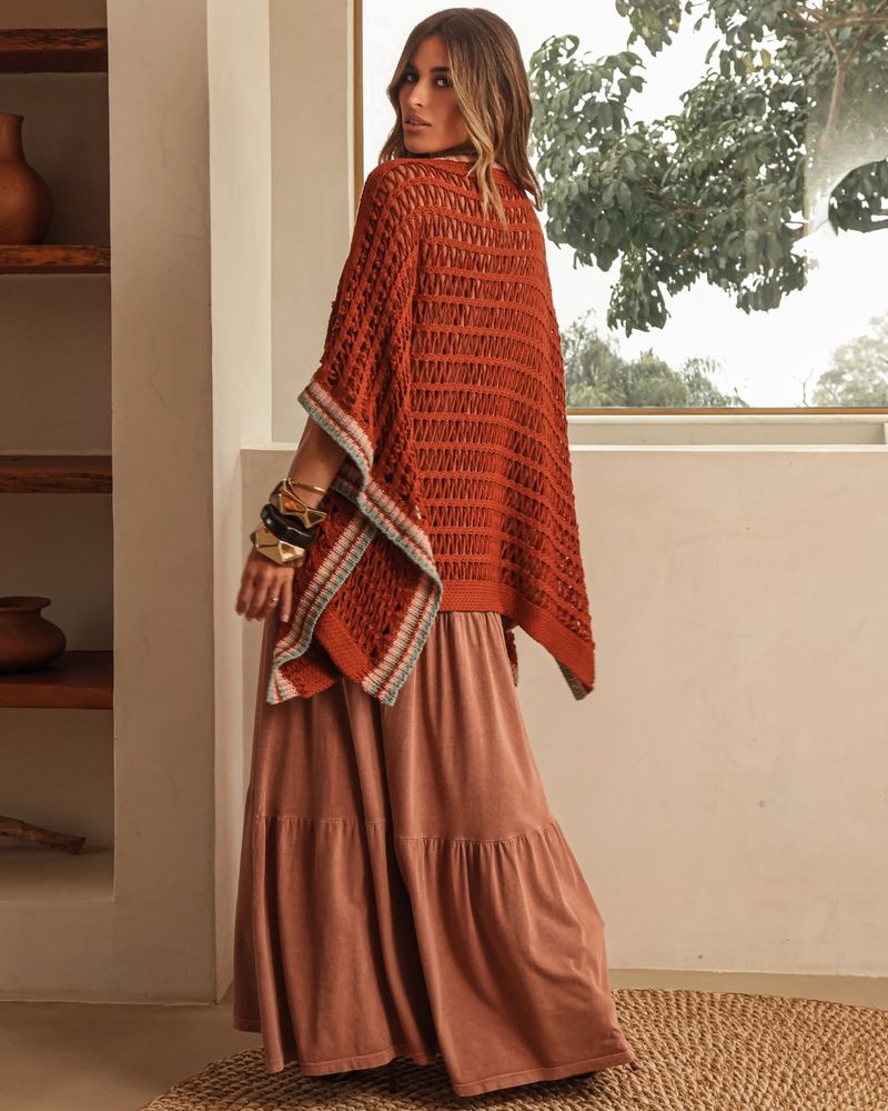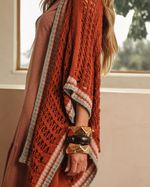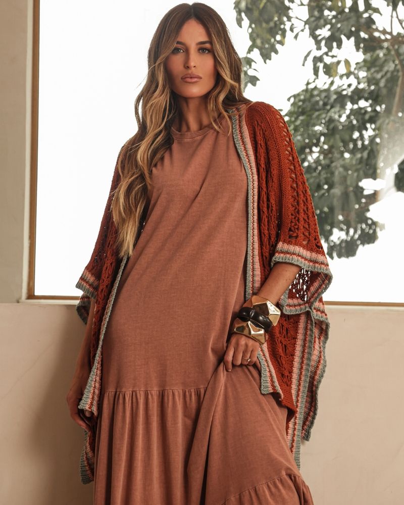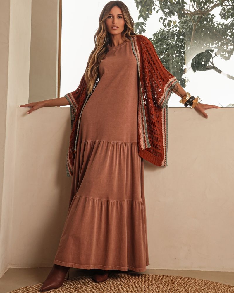 Kimono Marrom Avelã em Acrílico. Modelo em tricot, shape reto, mangas 3/4, com retilínea nas extremidades . Ideal para usar como sobreposição. Look Fashion.