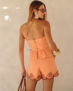 Short Papaia em Algodão. Modelo em sarja, cós alto, bolsos arredondados, barra com bordado arabesco, fechamento em zíper com botão transparente interno e botão de pressão externo. Ideal para usar com cropped ou regata. Look Verão Chic.
