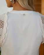 T-Shirt Bege Cream em Algodão com Elastano. Modelo em laise, mangas curtas, decote redondo e acabamento barra em laise. Ideal para usar com short-saia ou short. Look Romantic.
