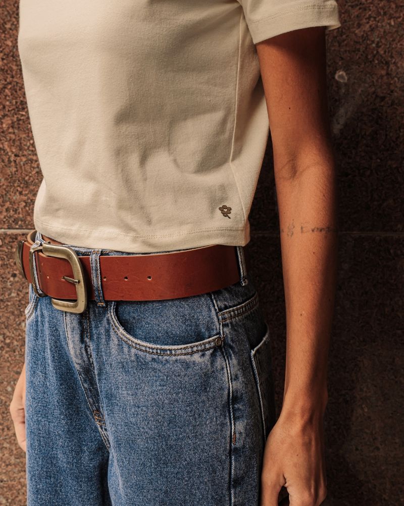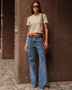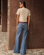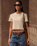 T-Shirt Bege em Algodão com Elastano. Modelo em malha, cropped, mangas curtas e decote redondo. Ideal para usar com short-saia ou calça de cós alto. Look Basic.