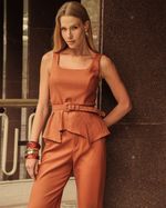Top Marrom em Linho com Viscose. Modelo estruturado, decote quadrado, alças médias, cavado, tipo basque, babado assimétrico na barra, com abertura na barra costas e fechamento em zíper costas. (Acompanha cinto na mesma cor). Ideal para usar com calça ou Short de cós alto. Look Chic.