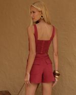 Top Recortes Vermelho em Algodão. Modelo em sarja, cropped, alças médias, decote quadrado , recortes com pespontos e fechamento em botões de pressão costas. Ideal para usar com short ou calça de cós alto. Look Fresh.