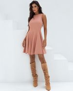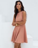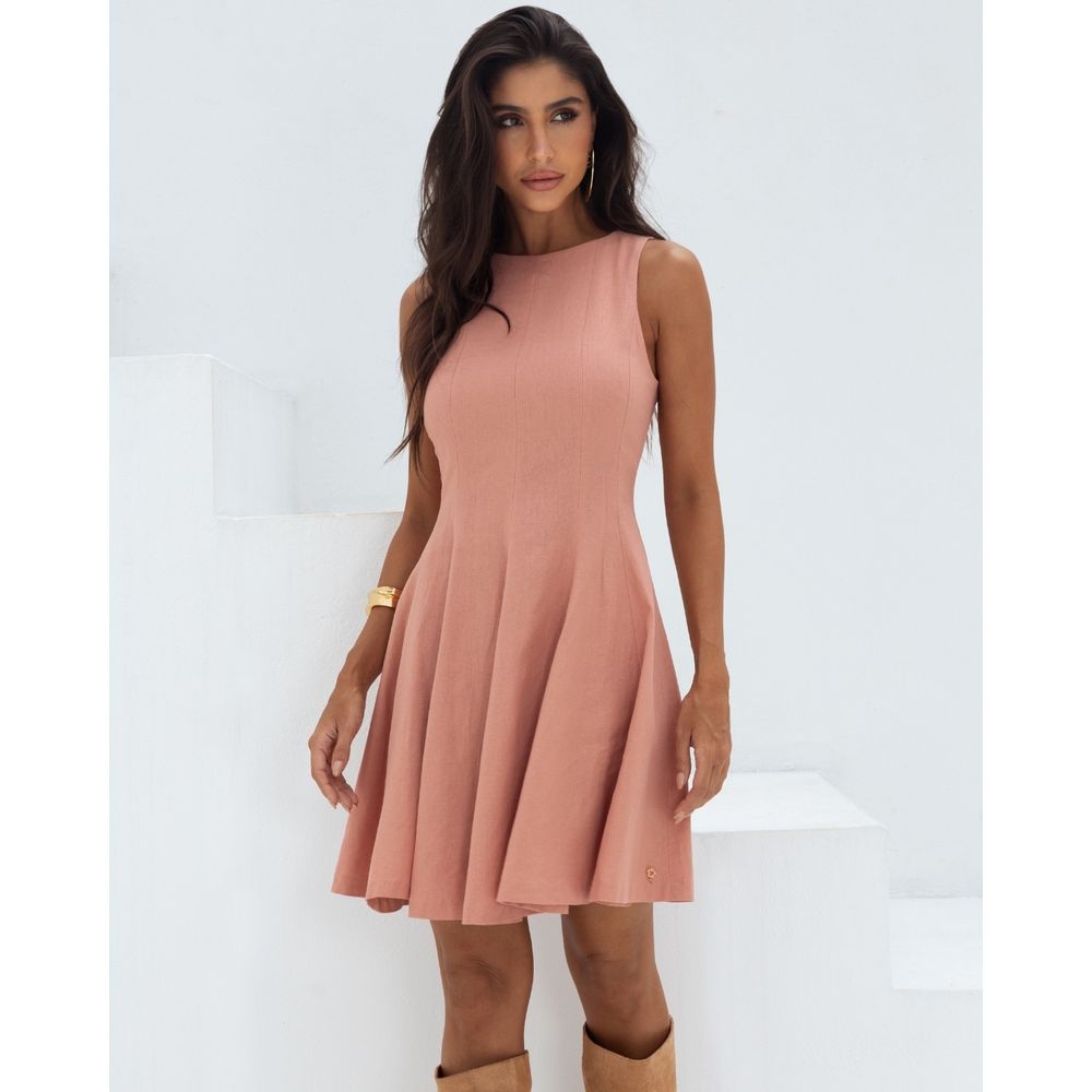Vestido Rosê Vintage em Linho com Viscose. Modelo curto, cavado e decote redondo, recortes godê e fechamento em zíper costas. Ideal para usar com sandália ou bota. Look Romantic.