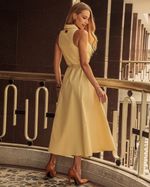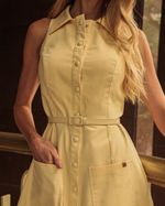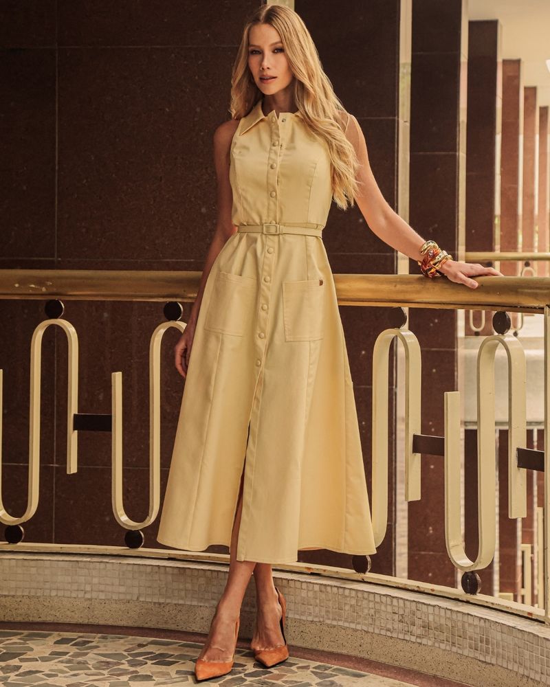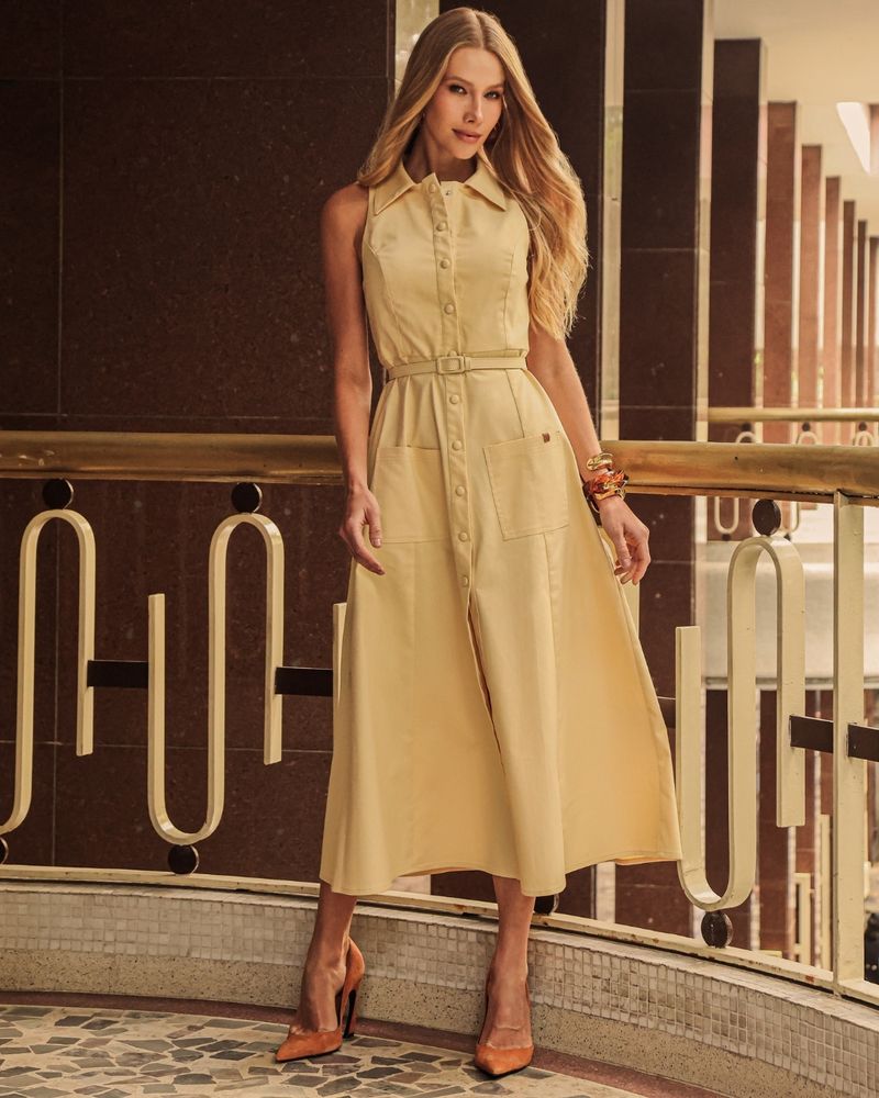 Vestido Amarelo em Algodão com Poliéster. Modelo midi, cavado, com gola, bolsos frontal, recortes com pespontos duplos, pregas na cintura, abertura frontal e fechamento frontal em botões de pressão. Acompanha cinto pespontado na mesma cor e tecido. Ideal para usar com sandália. Look Chic.