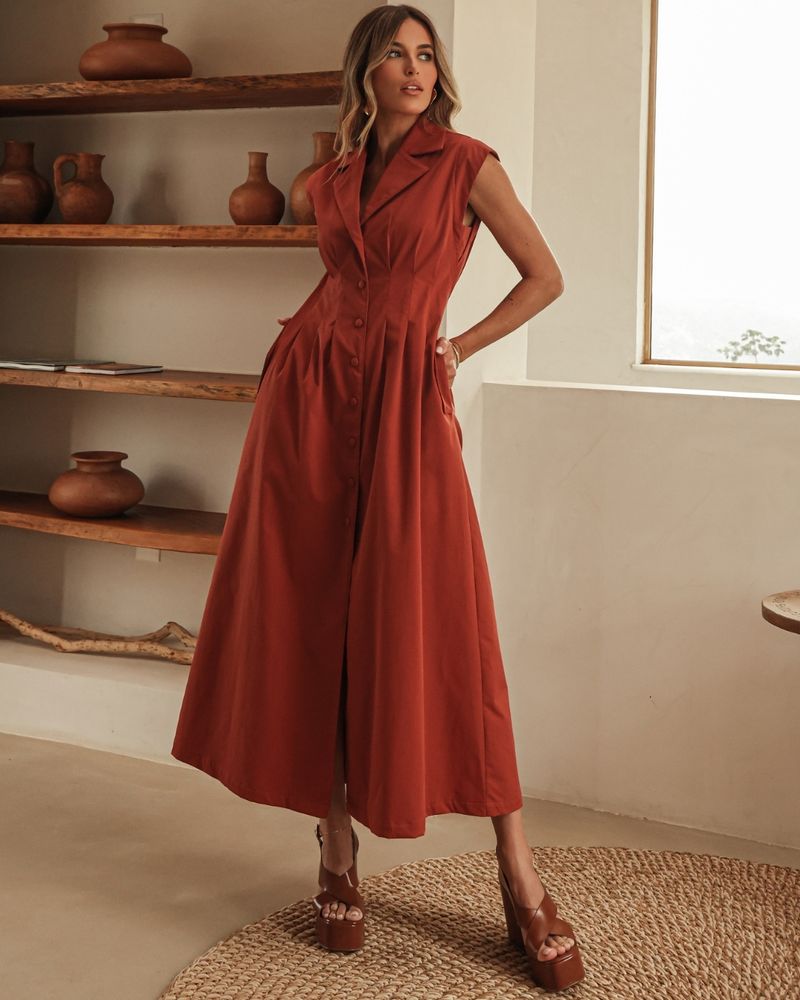 Vestido Trench Coat Marrom Ginger em Poliéster. Modelo mídi, cavado, com gola dupla em V, bolsos frontal com lapela presa com botão de pressão, cintura com pregas, cinto com regulagem na mesma cor e fechamento frontal em botões de pressão. Look Chic.