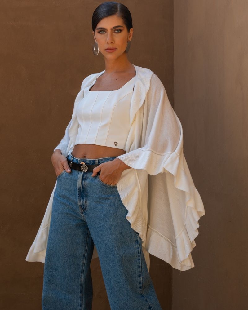 Xale Off White produzido em Acrílico com babados. Ideal para usar como sobreposição. Look Comfy.